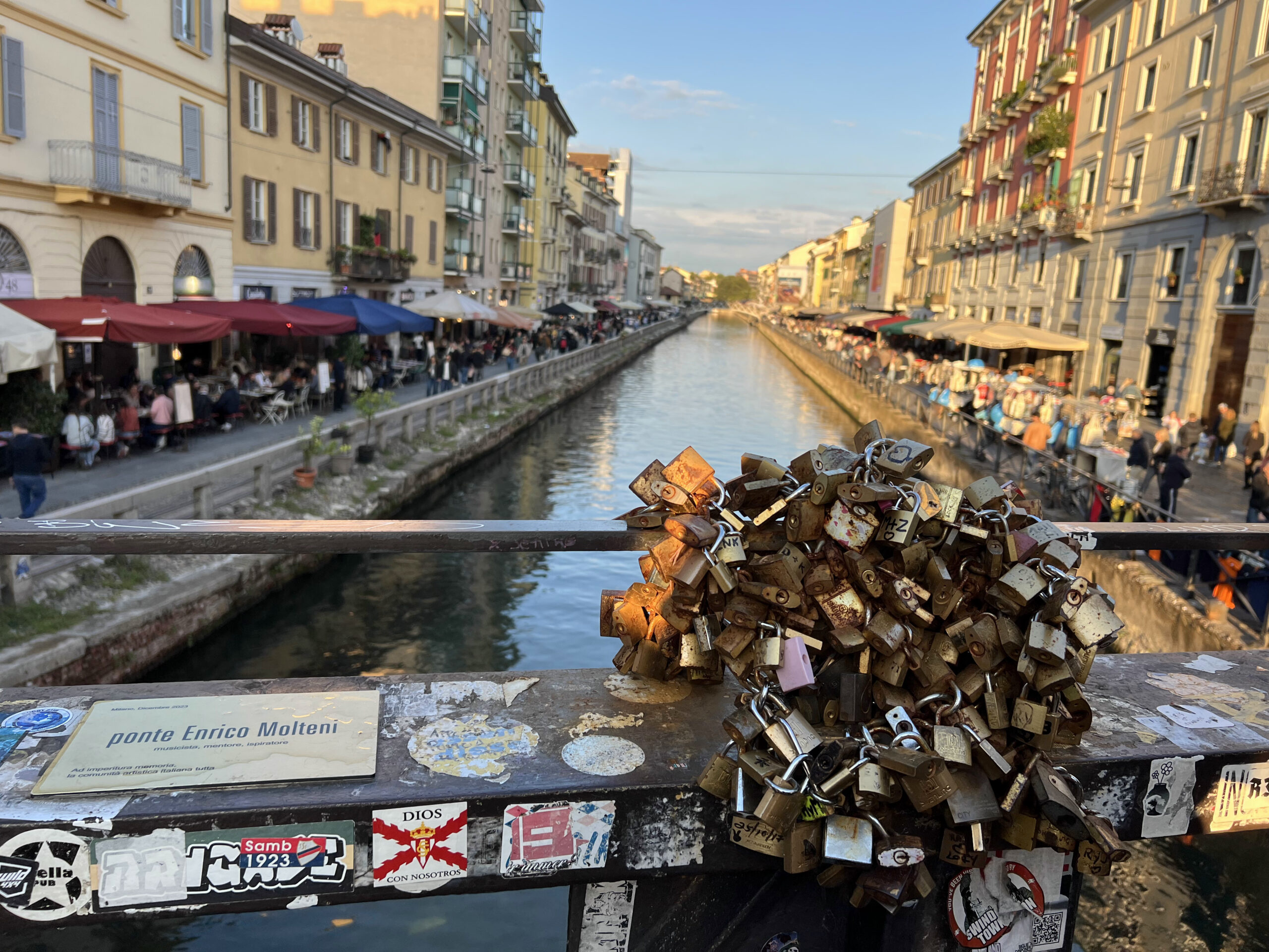 On est sur le Pont de fer Enrico Molteni, avec une magnifique vue sur le Naviglio Grande et les terrasses du quartier Navigli.
